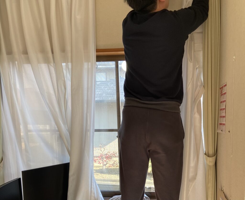 皆んなで手分けしてカーテンの洗濯。エアコン掃除。埃だらけになりました^ ^